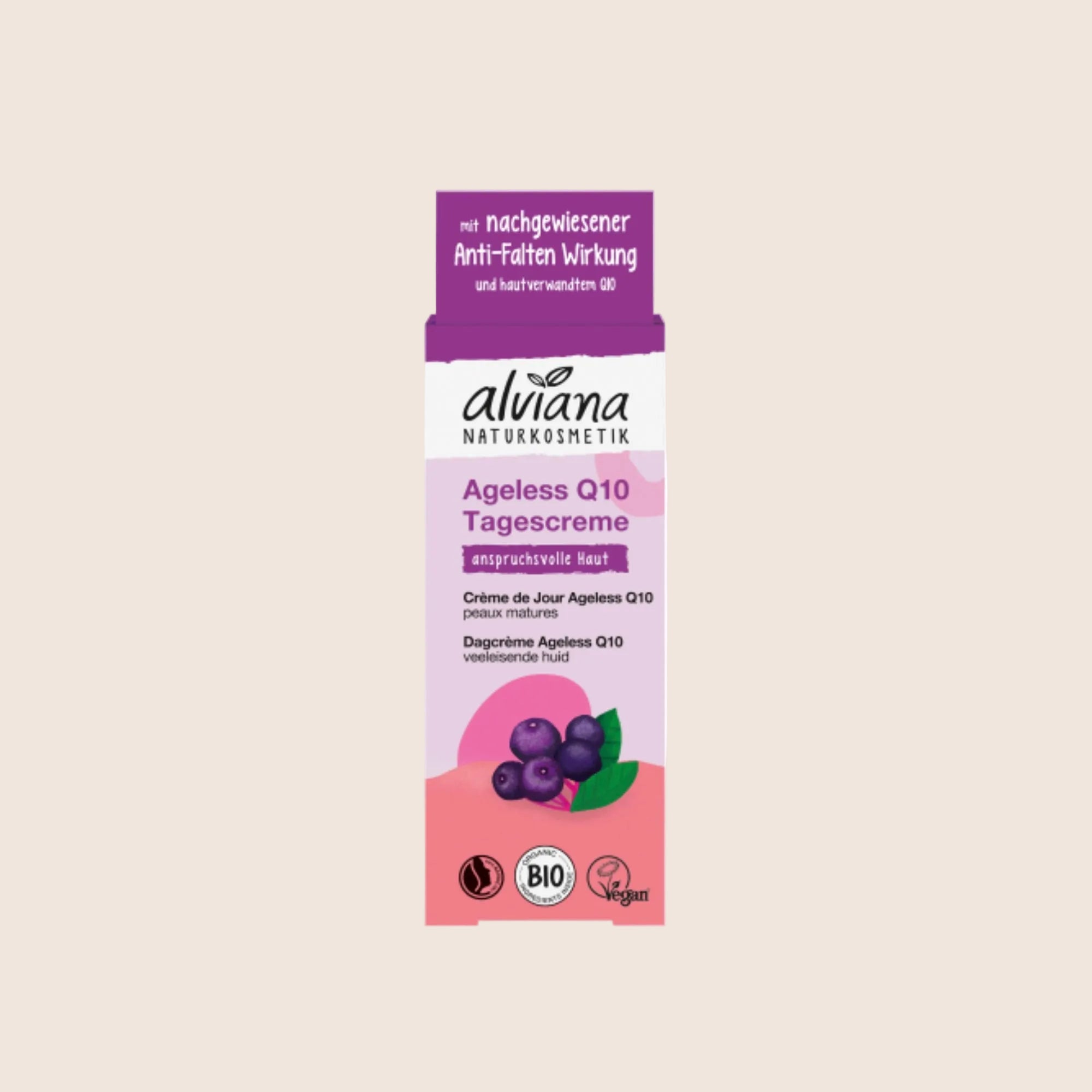 Restore youthful radiance with ALVIANA AGELESS Q10 DAY CREAM. This nourishing cream with organic aronia, almond oil, and jojoba oil strengthens the skin barrier and reduces the appearance of wrinkles.