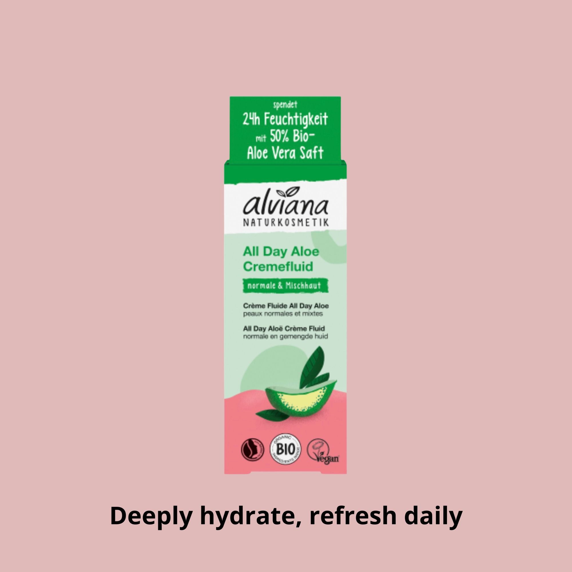 Light and refreshing, ALVIANA ALL DAY ALOE CREAM FLUID deeply hydrates normal and combination skin with the power of organic aloe vera juice.